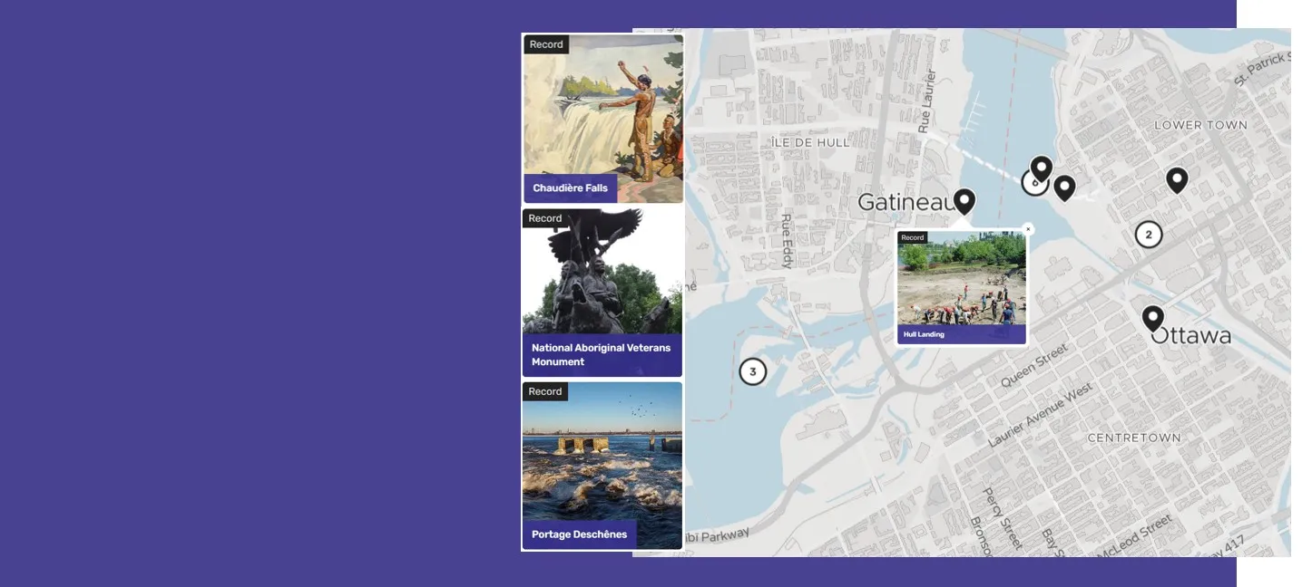 Explore the map to discover stories of resistance, cultural landmarks, and key locations that have shaped the Algonquin Nation's past and present. These records reveal the enduring presence of the Algonquin people as well as some of the ways in which settler colonial processes have attempted to destroy and erase their presence on the land. Engage with the history and learn more about the stories of the original people of this land and their stories along the Ottawa River.